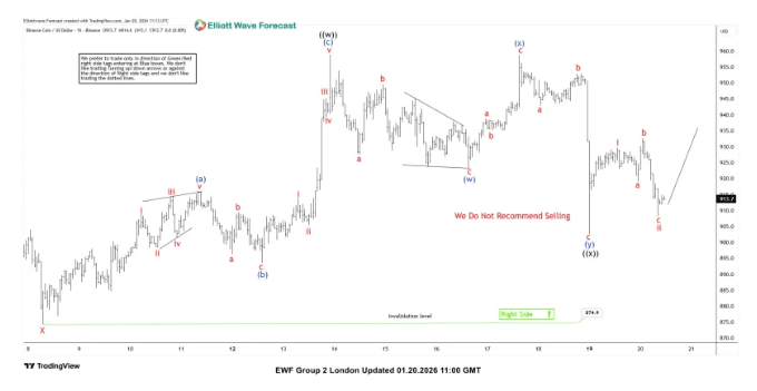 👉 L'immagine tecnica mostra una sequenza correttiva disordinata con diverse onde secondarie durante il recente calo. Ciò che conta ora è che il prezzo si sia mantenuto fermo sopra il livello critico di invalidazione di $874.9—fondamentalmente la linea di demarcazione per questo setup. Da lì, BNB ha iniziato a salire con oscillazioni più forti a breve termine, segnalando che la pressione al ribasso immediata potrebbe essere finita. "Vendere non è raccomandato in quest'area," nota l'analisi, sostenendo la visione che i ribassisti stiano perdendo slancio per ora.