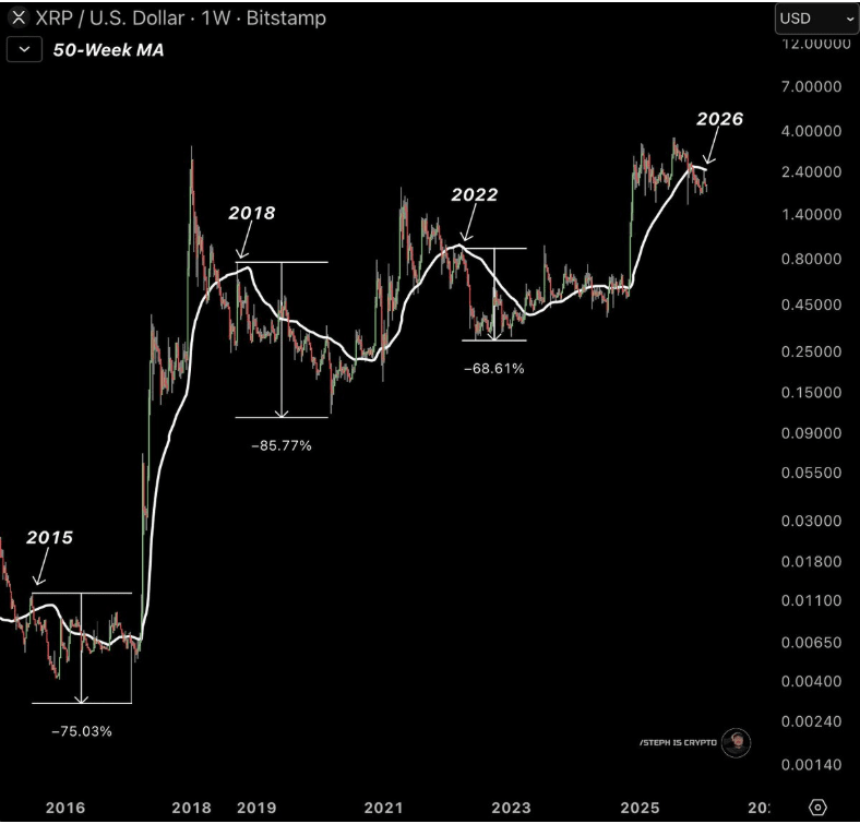 $XRP sta negoziando vicino alla sua media mobile semplice a 50 settimane, un livello tecnico che storicamente ha innescato importanti cali di prezzo del 69-86% attraverso molteplici cicli di mercato risalenti al 2015.