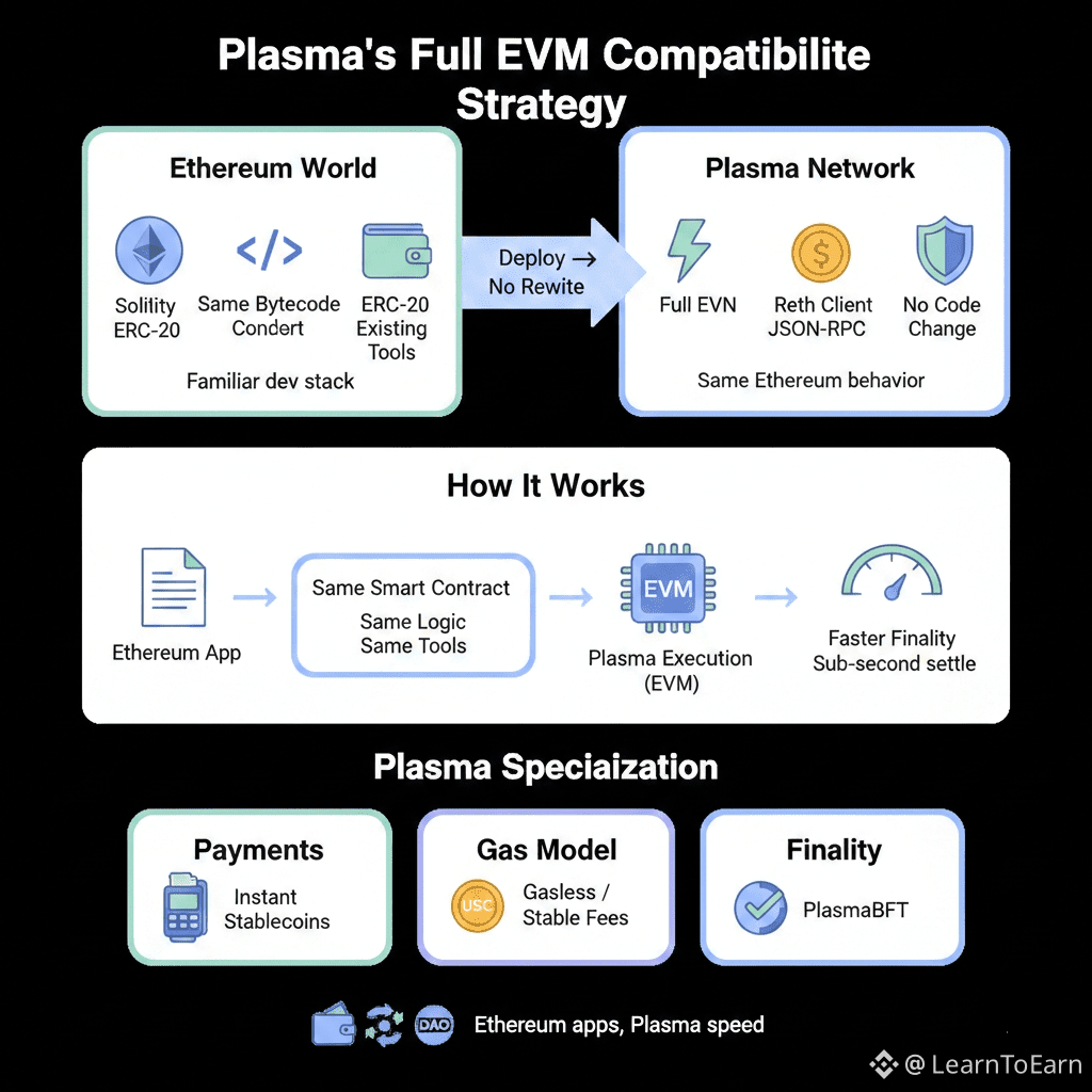 Ultimately, Plasma’s full EVM compatibility reflects a pragmatic philosophy. Instead of forcing developers to abandon familiar tools in exchange for performance, it removes the choice entirely. Builders can bring their skills, code, and communities onto a network that is optimized for stablecoins yet deeply integrated with Ethereum’s ecosystem. By eliminating friction at the execution layer and innovating everywhere else, Plasma positions itself not as an experimental alternative, but as a practical and adoptable settlement layer capable of supporting stablecoins as true digital cash in the global economy.
