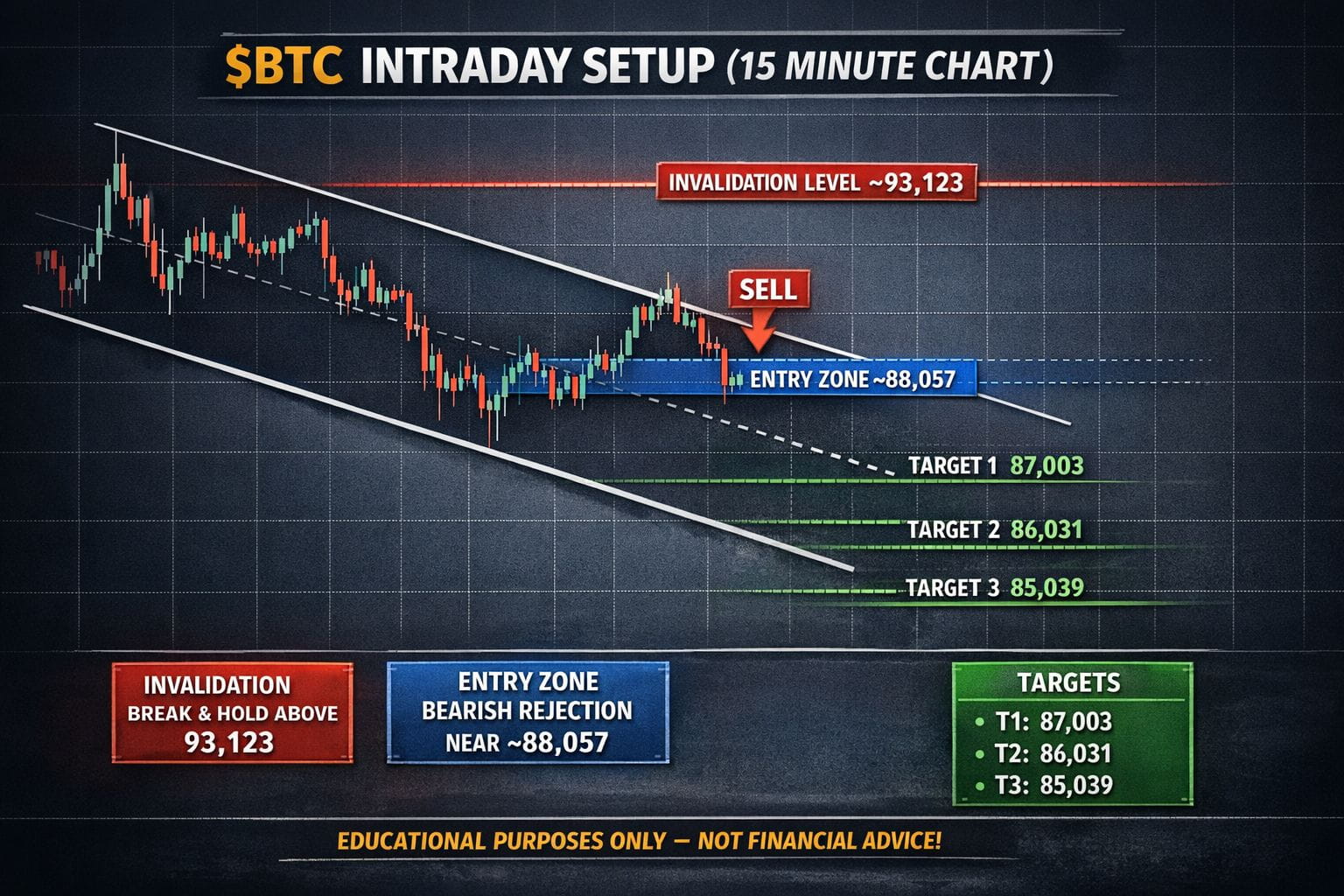Bitcoin price is currently trading within a well-defined descending channel on the 15-minute timeframe. After a short-lived push above the channel’s midline, price has rotated back and is now retesting the upper half of the channel, keeping the broader intraday structure bearish.