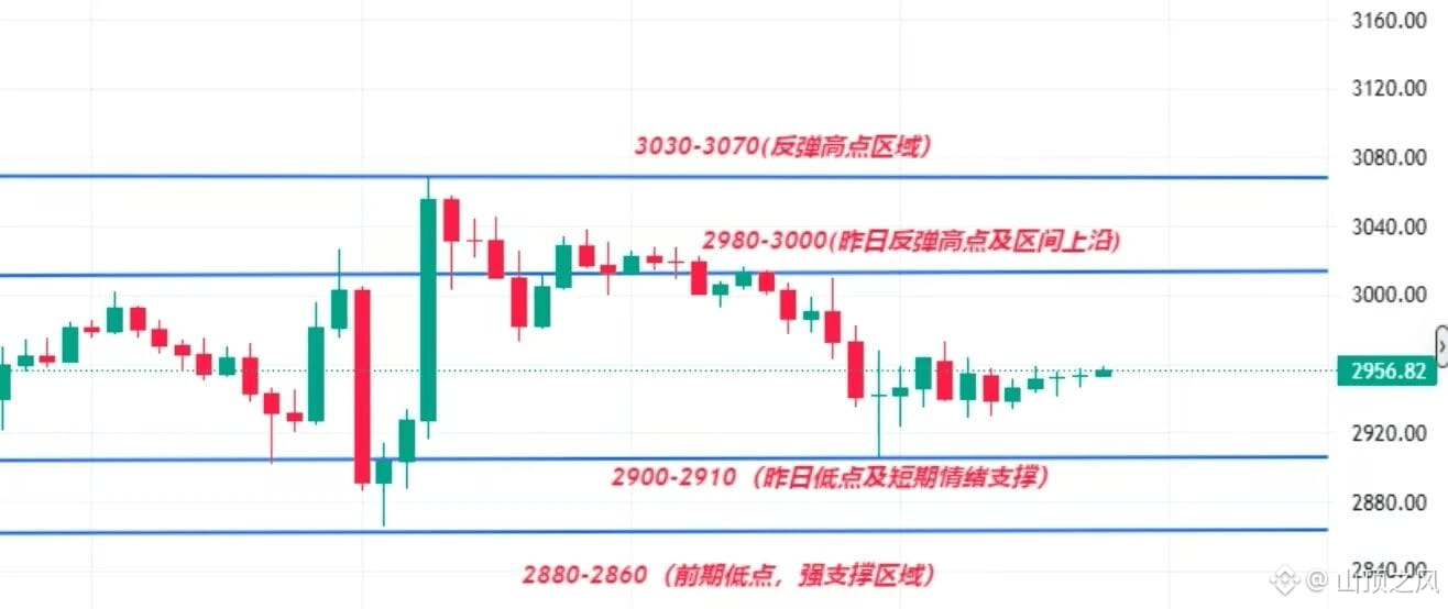 四小时线:此前冲击3070美元未果后持续回落,整体走势偏空。2920美元为核心筹码密集区。下方支撑重点关注2900-2920美元,阻力看向3000美元整数关口及3120美元。KDJ指标即将形成死叉,短期下行风险依然存在。