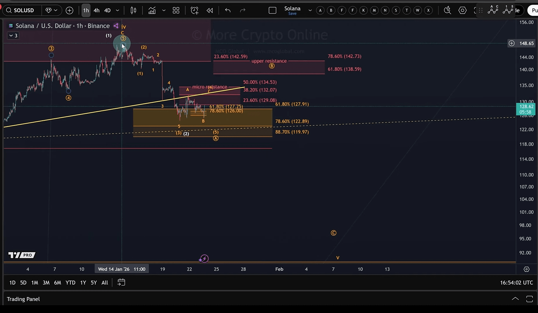 Il $SOL chart mostra segni che una quinta onda (v) al ribasso potrebbe formarsi dopo che una quarta onda (iv) ha raggiunto il picco intorno al 14 gennaio. Questa potenziale quinta onda potrebbe raggiungere $91 o leggermente inferiore ed è prevista in un struttura A-B-C. Un modello simile è visibile anche nel grafico di Bitcoin, suggerendo un allineamento più ampio del mercato.