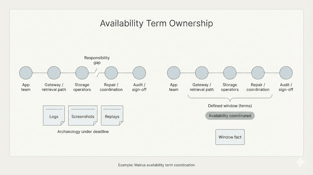 Walrus non rende lo storage magico. Rende gli impegni espliciti. La disponibilità è circoscritta. Le finestre hanno nomi. Le prove hanno scadenze. Se i dati ci sono, ci sono in base a termini ai quali puoi riferirti. Se non ci sono, non c'è una storia soft su come fosse 'probabilmente a posto.'