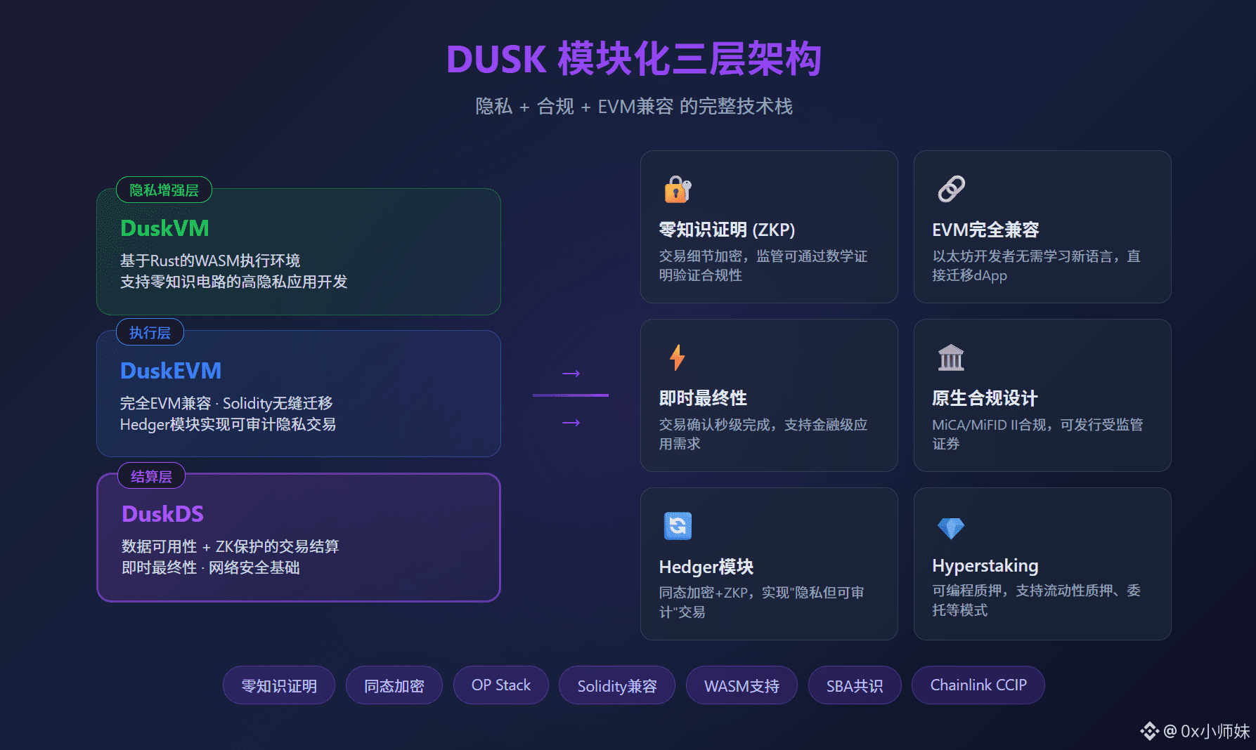 DuskDS是结算层,负责最底层的交易确认和数据存储,所有交易都用ZK技术保护。DuskEVM是执行层,完全兼容以太坊,Solidity开发者可以无缝迁移。DuskVM是隐私增强层,支持用Rust写更复杂的隐私应用。