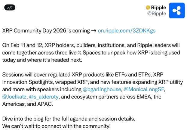Ripple ha annunciato l'organizzazione di un Community Day $XRP per il 2026. L'evento si terrà il 11 e 12 febbraio. Si estenderà su tre sessioni dal vivo su spazi X dedicati alle aree Europe, Medio Oriente e Africa, Americhe, e Asia-Pacifico. Ripple ha dichiarato che l'obiettivo è riunire i possessori di XRP, sviluppatori, istituzioni e leader del settore. Le sessioni si concentreranno su come XRP viene utilizzato oggi e sulla direzione futura. Gli argomenti includeranno prodotti XRP regolamentati, fondi ETF, finanza decentralizzata, XRP incapsulato e nuovi strumenti sul libro mastro XRP.