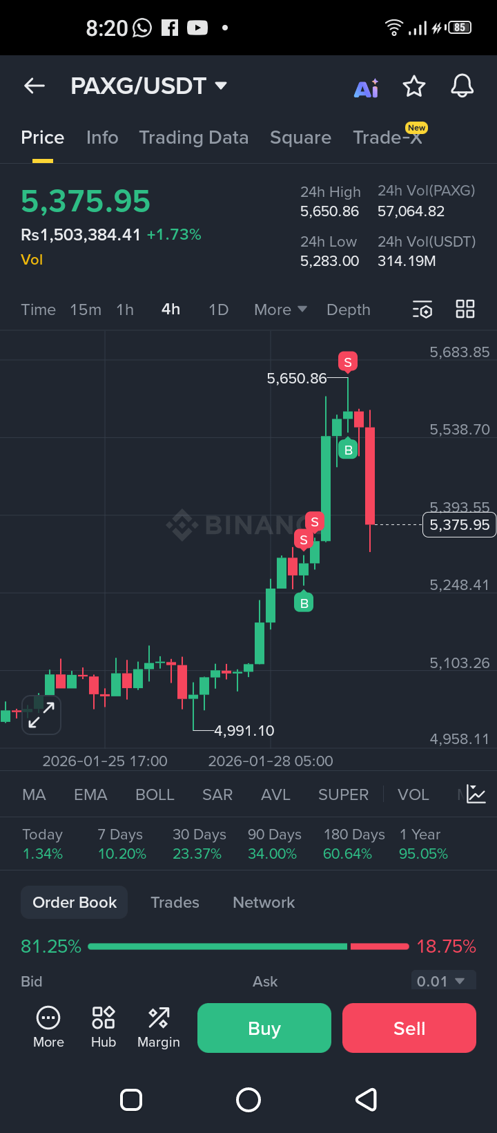 * Il Cambiamento "Risk-Off": Il denaro sta attualmente ruotando fuori dalle crypto speculative (come gli altcoins) e in "asset durevoli" come PAXG. La candela rossa nel tuo screenshot è il mercato che cerca di riprezzare PAXG per allinearsi al prezzo spot attuale dell'oro fisico dopo un breve momento di "eccesso di entusiasmo."