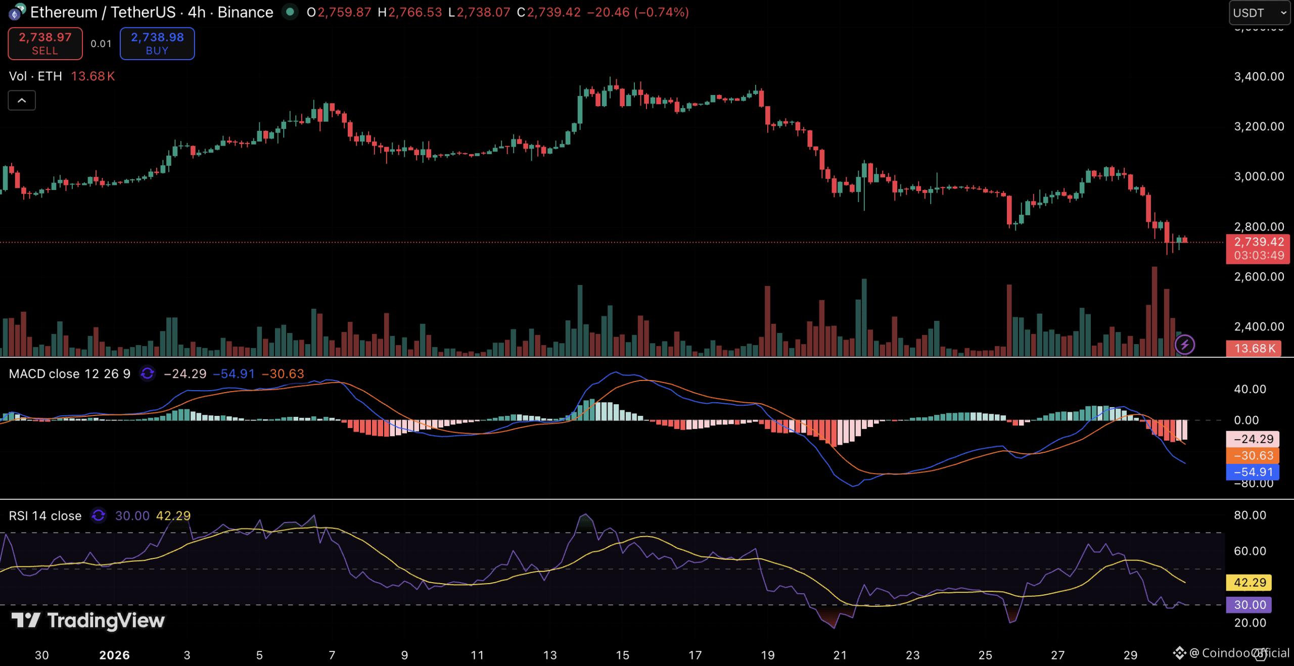 On the 4-hour chart, RSI has fallen into the low-40s, drifting closer to oversold territory and signaling fading bullish momentum rather than a clear rebound. MACD has flipped firmly bearish, with the signal lines crossing lower and the histogram expanding into negative territory, confirming growing downside pressure.
