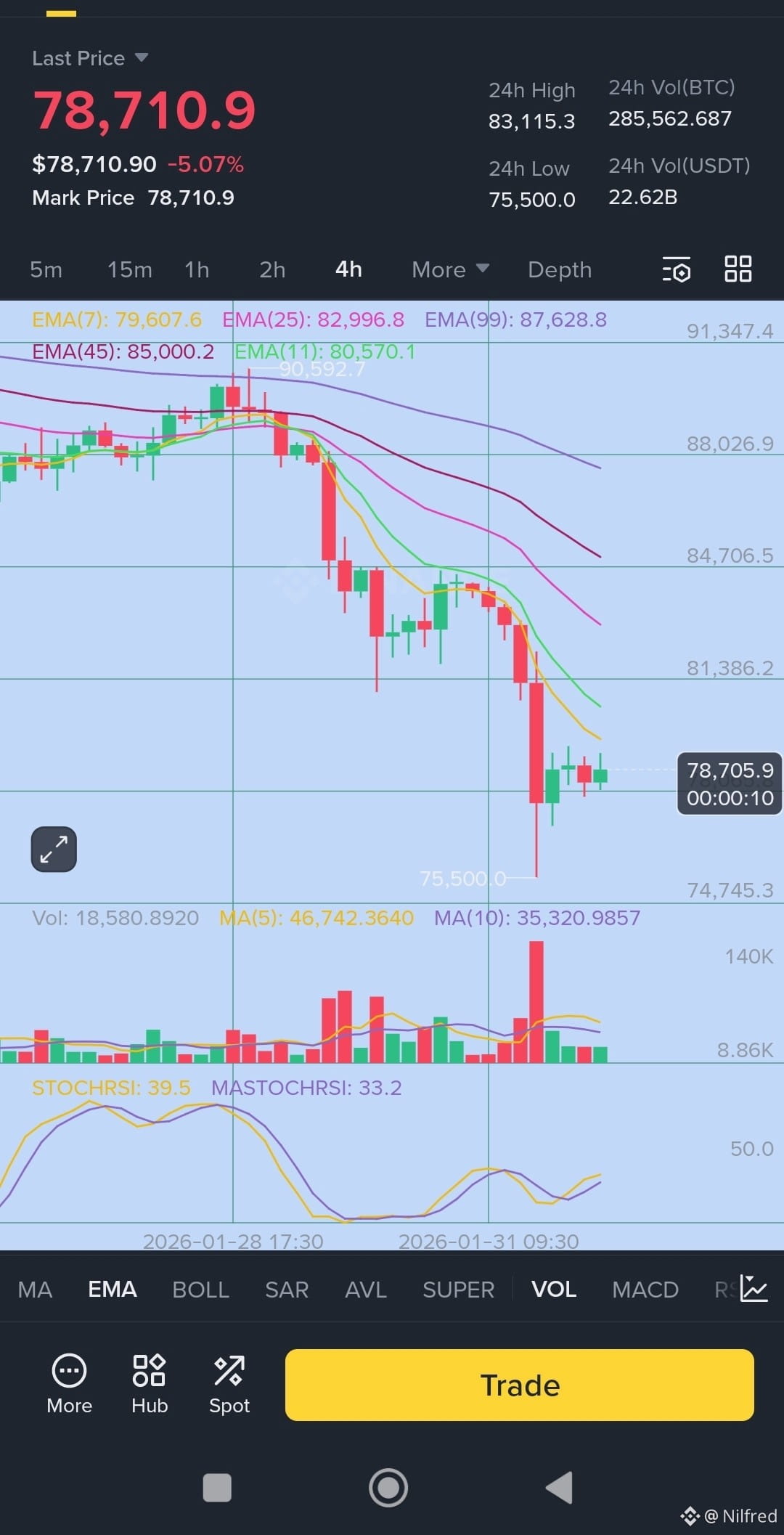 Bitcoin is trading around 78000 to 79000 right now (down about 5 to 7% in the last 24 hours as of Feb 1 2026). It's correcting hard from recent highs near 90k plus (all time high was around 126k late 2025). Main reasons: big ETF outflows (billions pulled recently), leverage getting liquidated, macro worries (Fed stuff, stronger USD), and people taking profits after the huge 2025 run.