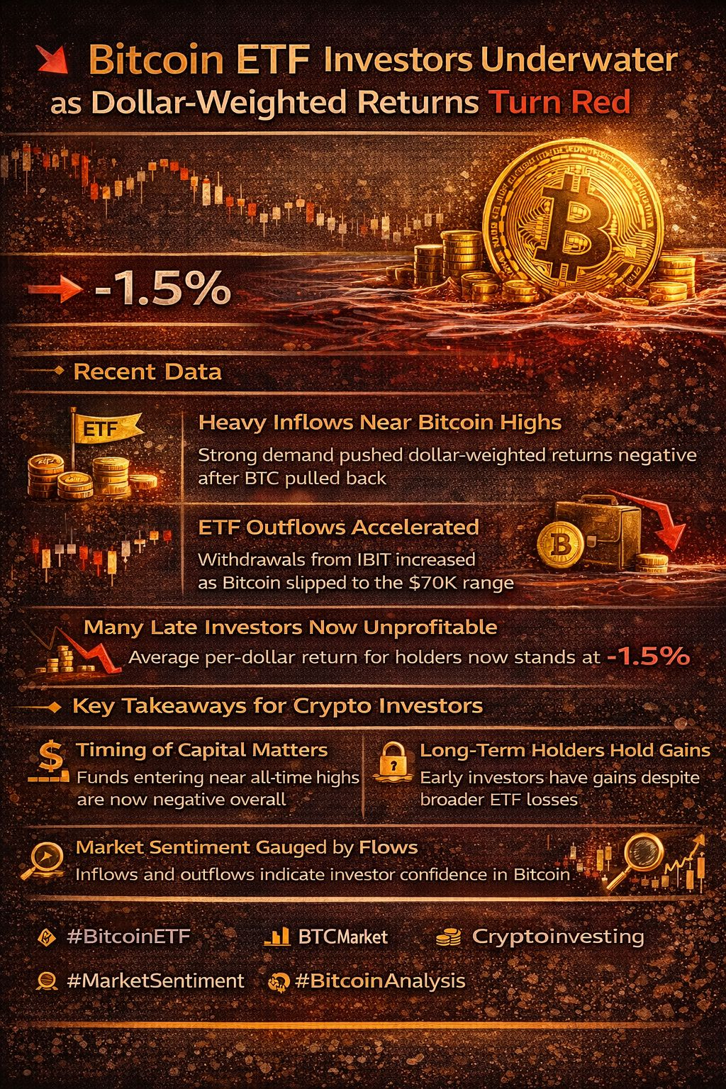 Mentre il BTC scendeva, gli investitori che avevano acquistato vicino al massimo hanno visto le loro posizioni passare in perdita, portando il rendimento ponderato in dollari complessivo al di sotto dello zero.La dinamica dei flussi ETF riflette il sentiment