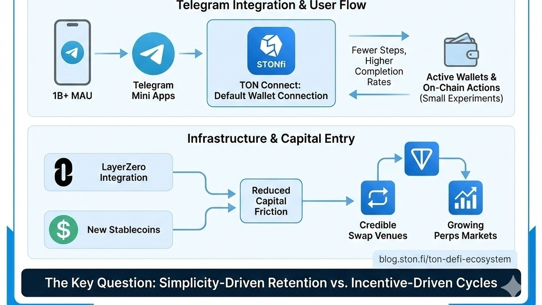 製品の便利さだけでは不十分です。インフラも資本の参入摩擦を下げる必要があります。LayerZeroなどの統合やステーブルコインの展開により、TONへの価値の移動が痛みを伴わなくなりました。以前はユーザーがチェーンを移動し、ブリッジ手数料を支払う必要があったかもしれませんが、改善されたクロスチェーンメッセージングとネイティブのようなステーブルコインオプションは、参入のコストと複雑さを削減しました。