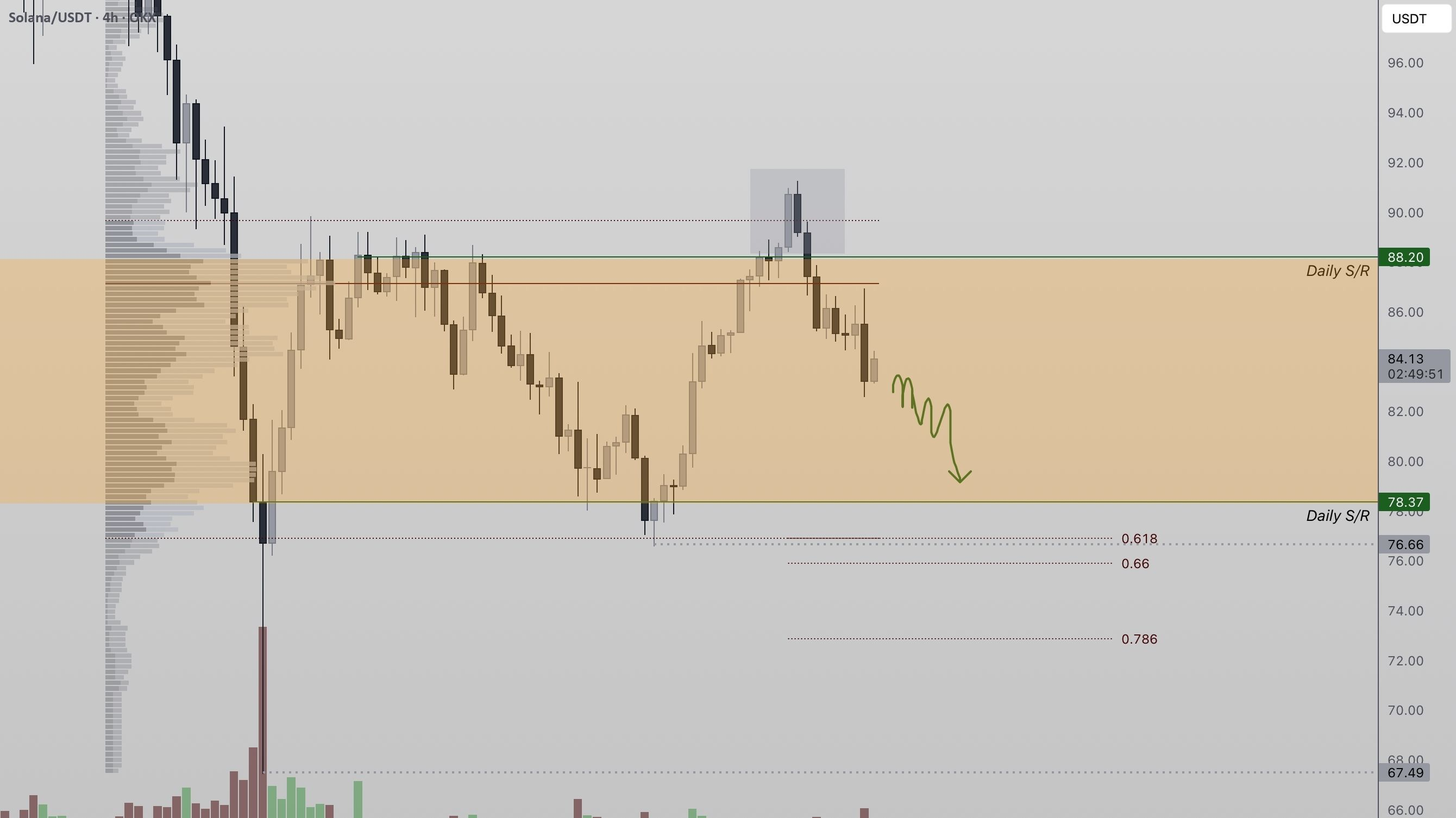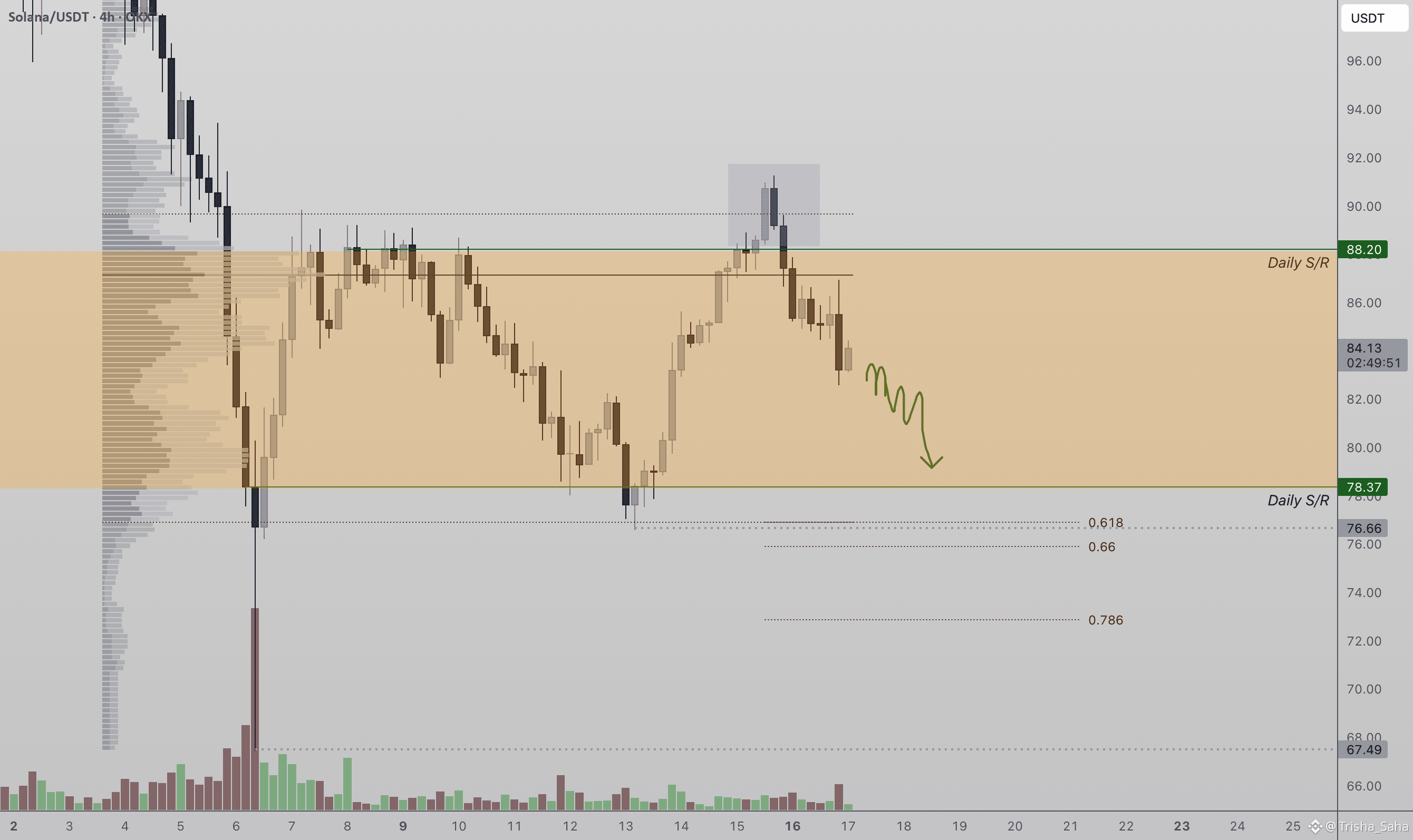 The next downside target now sits near $78, which represents high-timeframe support and aligns with the value area low. This region is technically significant, as the 0.618 Fibonacci retracement rests just below it, creating a strong confluence zone where price is likely to react.