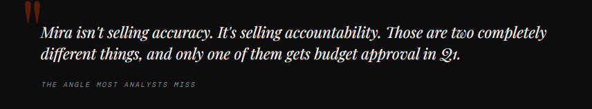 Mira isn't selling accuracy. It's selling accountability. Those are two completely different things, and only one of them gets budget approval in Q1.