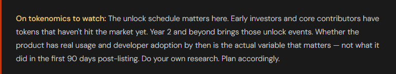 The tokenomics matter going forward. Early investors and contributors have tokens that haven't fully hit the market yet. Unlock events in year two and beyond are the real variable to watch — not what happened in the first 90 days.