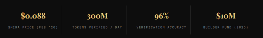 Developer adoption. The mainnet and SDK launched September 2025. Are developers actually building on it? Look for live applications integrating Mira Verify — not just partnership announcements.