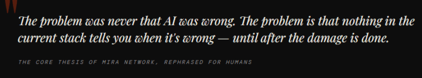 Most writers will tell you Mira solves "AI hallucinations." That's accurate but it undersells the actual stakes.