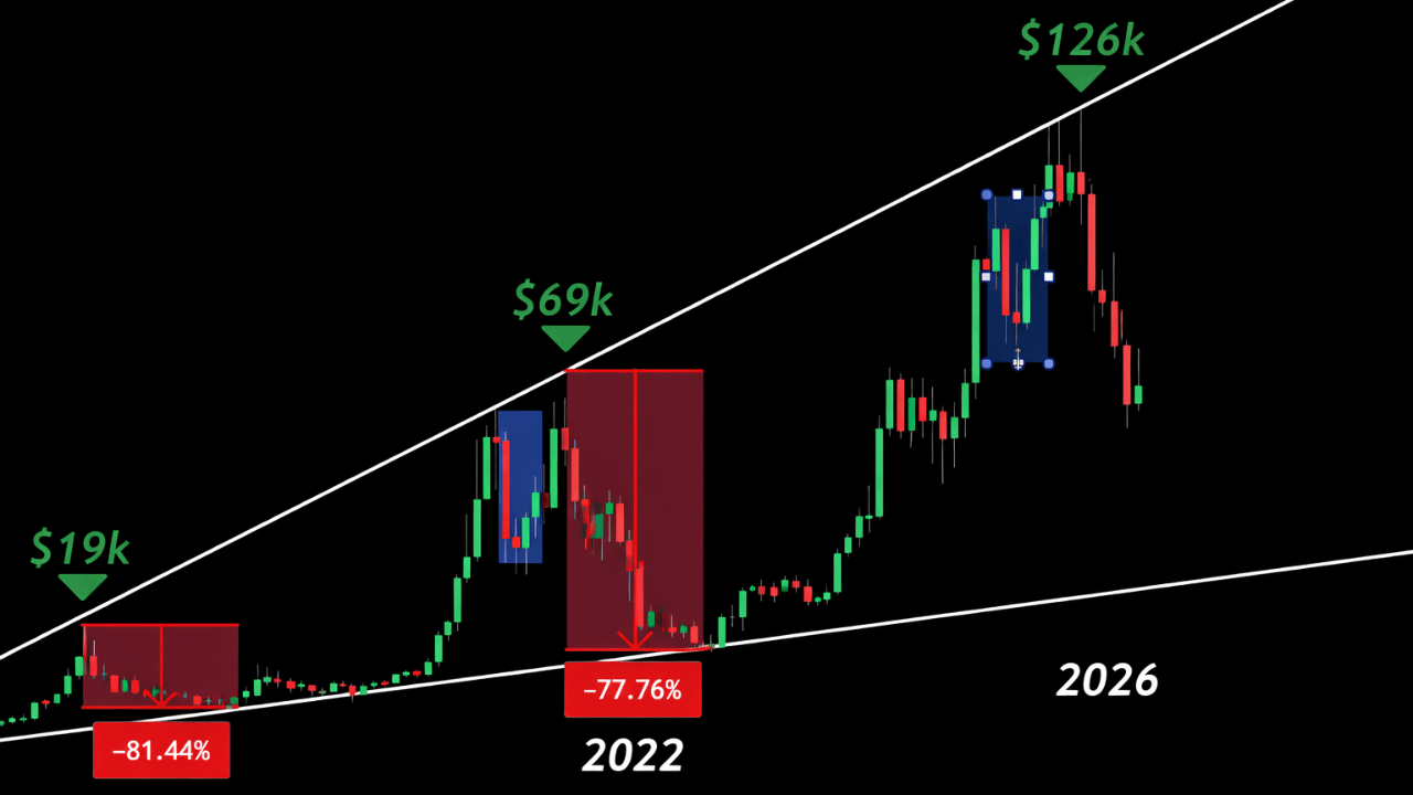 2018年、ビットコインは19,000 USDから81%以上も下落しました。2022年のサイクルでは、価格は69,000 USDから急落し、約77%の価値を失いました。これは、強い調整が例外ではなく、BTCのサイクル行動の中でほぼおなじみの部分となっていることを示しています。