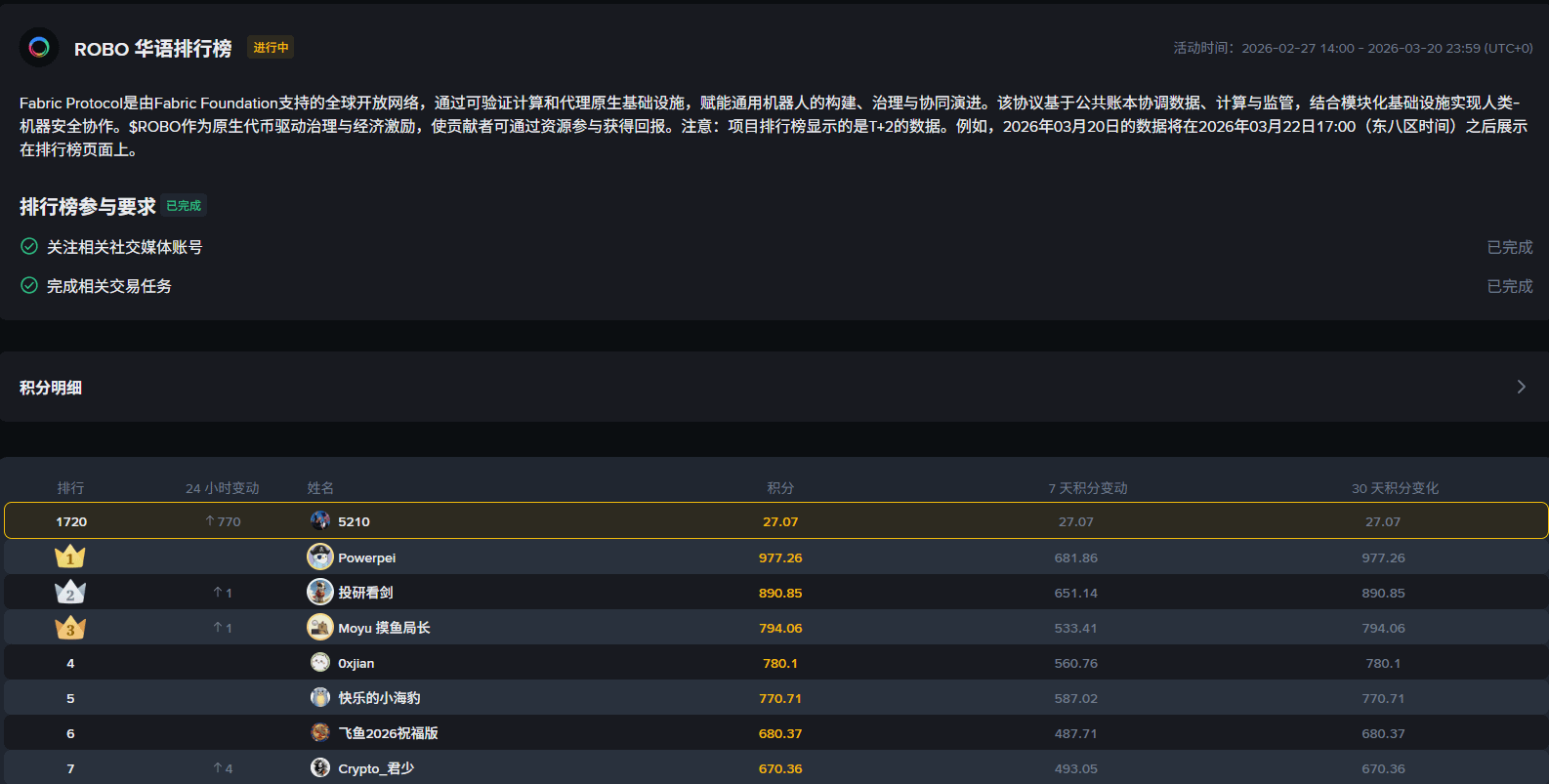 Fabric 的排行榜存在数据延迟。例如,你在 2026年3月20日 完成的杰出贡献或获得的高互动,其数据快照要到 2026年3月22日 17:00(东八区时间) 之后才会更新。