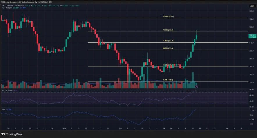 However, investors considering TAO should remain cautious. Despite the strong weekly performance, the token still trades within a broader medium-term downtrend. The $268 price level coincides with the 78.6% Fibonacci retracement, making it a significant resistance zone. If buying pressure weakens, a short-term pullback could occur within the next few days.