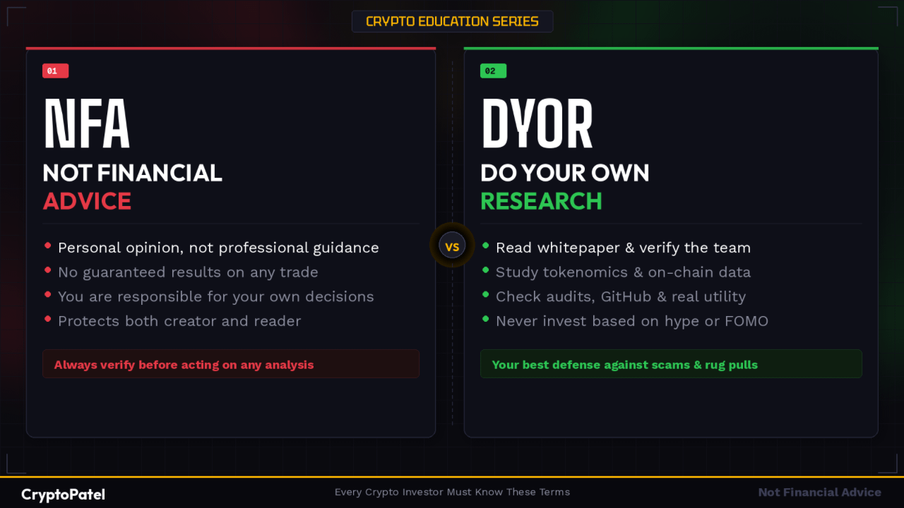 例:誰かが「$BTCは強気に見える、目標は$100K - NFA」と言う場合、彼らは自分の見解を共有しているだけで、結果を保証しているわけではありません。