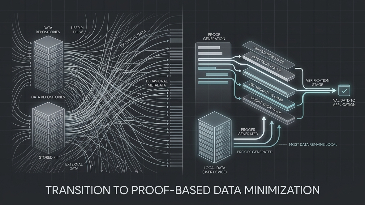 これが私のミッドナイトに対する見方が変わったところです。プライバシーは暗号の中で役立つ言葉ですが、しばしば狭すぎます。それは人々に秘密が唯一の利益だと思わせます。ミッドナイトは、データ最小化システムとして見ると、より興味深くなります。アプリケーションに生の情報の代わりに証明を要求する方法を提供します。あなたは十分に年を取っていますか?資格がありますか?適格ですか?この条件は満たされましたか?多くの場合、それがシステムが本当に知っておくべきすべてです。それは、将来の負債爆弾のように、企業サーバー上にフルアイデンティティファイルを置く必要はありません。