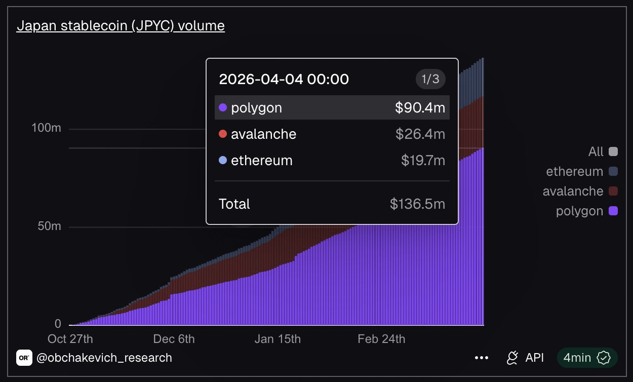 The token, issued by JPYC Inc. in October 2025, has generated $137 million in trading volume over the past six months. During this period, Polygon dominates usage, accounting for 66% of activity ($90.4 million), while Avalanche and Ethereum follow.