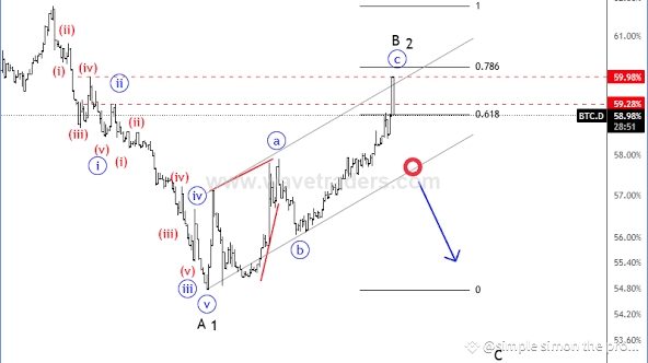 Dominacja *Bitcoina* (procent całkowitej kapitalizacji rynkowej, którą Bitcoin posiada) spada. Gdy dominacja Bitcoina zaczyna spadać, zazwyczaj sygnalizuje to, że *altcoiny* zaczynają rosnąć. Jeśli Bitcoin się ustabilizuje lub skonsoliduje, altcoiny zazwyczaj zyskują więcej uwagi od traderów.