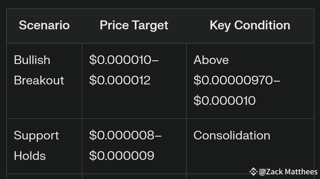 Cele: Jeśli momentum się utrzyma, PEPE może przetestować $0.00001000–$0.00001150, a niektórzy analitycy prognozują krótkoterminowy wzrost do $0.00001163 lub wyżej.