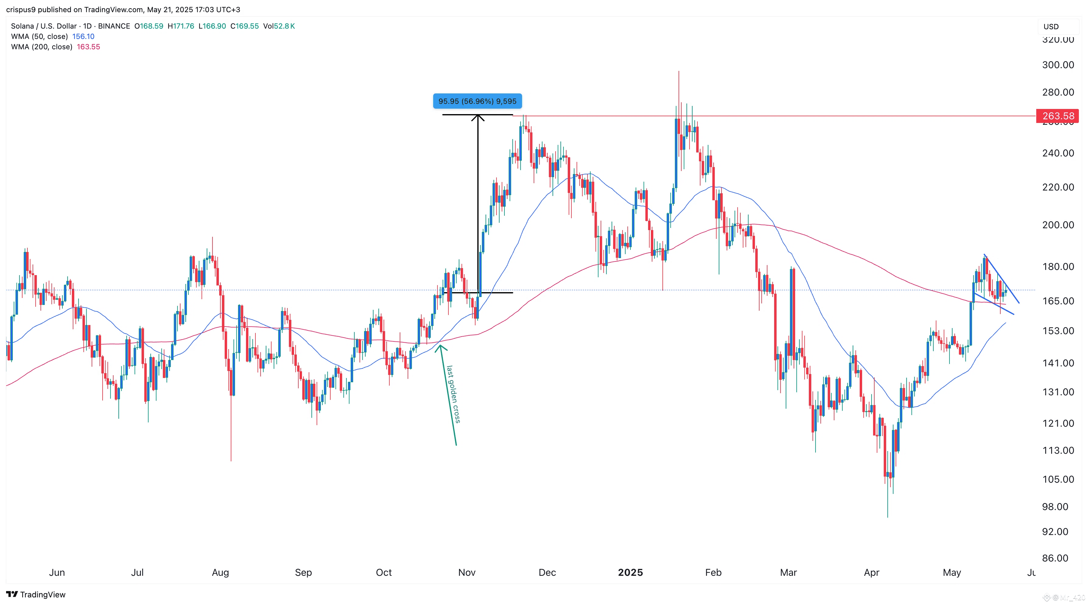 $SOL cena również uformowała byczą flagę i wzór opadającego klina na dziennym wykresie. Jest również na najlepszej drodze do uformowania wzoru złotego krzyża, co może doprowadzić do osiągnięcia historycznego maksimum.