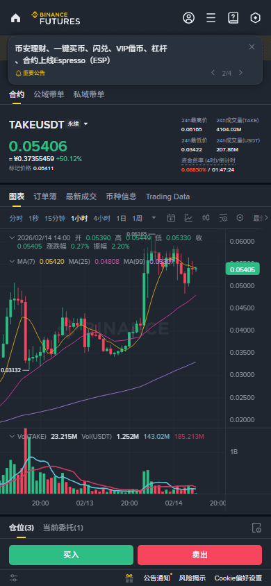 $TAKE 1H级别在经历昨日史诗级拉升后,目前正处于健康的旗形整理末端。价格在0.0500-0.0550区间强势盘整,1H EMA20(0.0510)构成动态支撑。关键点在于:价格从高点0.059回撤近15%,但持仓量(OI)保持稳定,并未出现恐慌性出逃,这是典型的主力护盘信号。结合高达0.0895%的资金费率,空头持仓成本极高,任何一次向上的突破都可能引发轧空行情。4H级别站稳EMA20(0.0397)上方,趋势未改,当前1H级别的回踩是绝佳的二次上车机会。