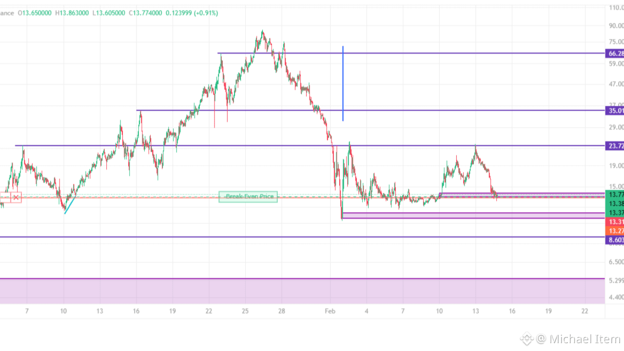 Dopóki cena utrzymuje się powyżej $13.20, możliwy jest odbicie w kierunku strefy $18–$23.