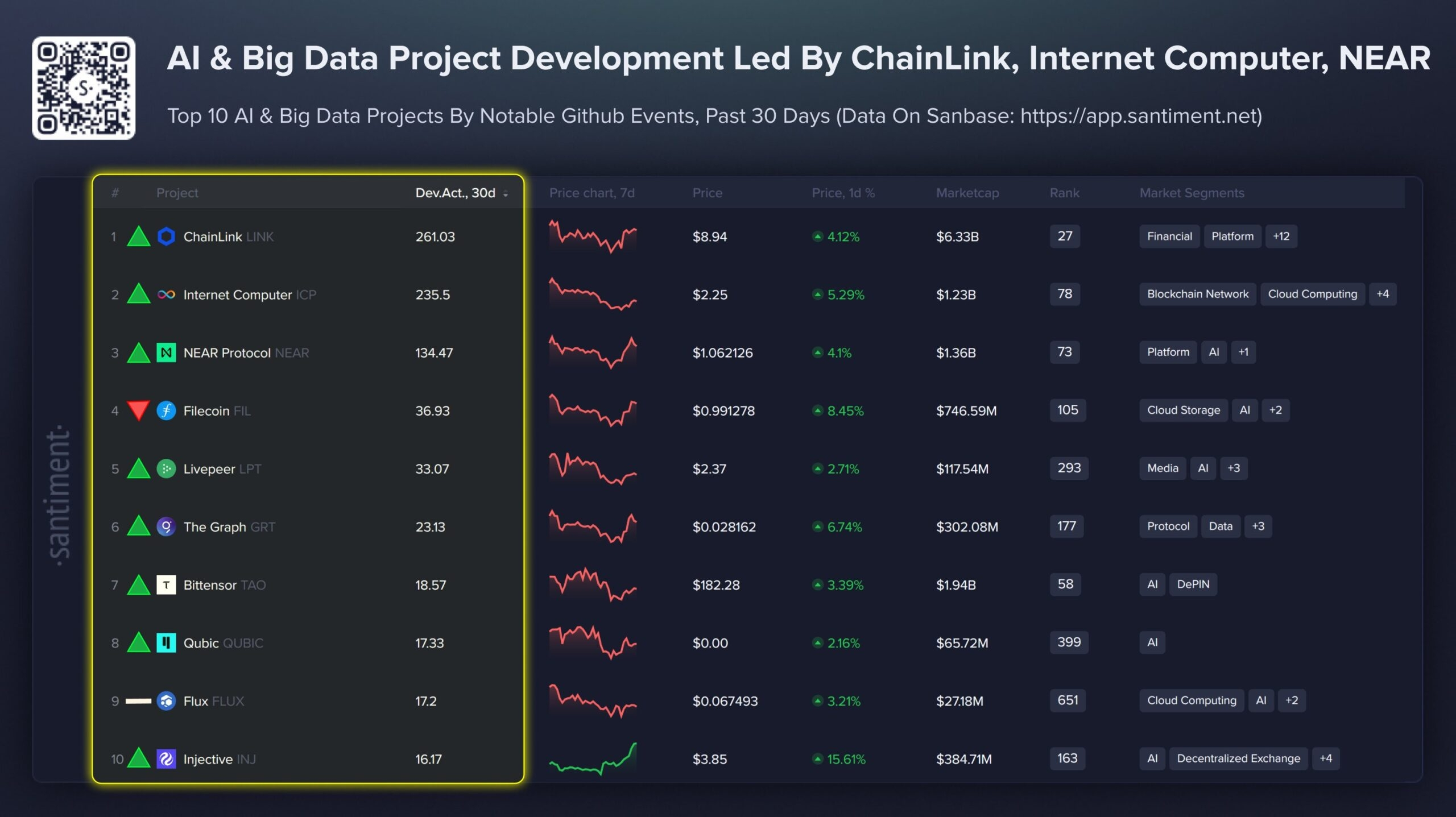 According to the latest data shared by Santiment, projects building core infrastructure for AI, storage, indexing, and decentralized finance are leading GitHub activity. The trend reflects a broader effort to reduce reliance on centralized tech giants by shifting computing, data, and financial systems onto decentralized networks.