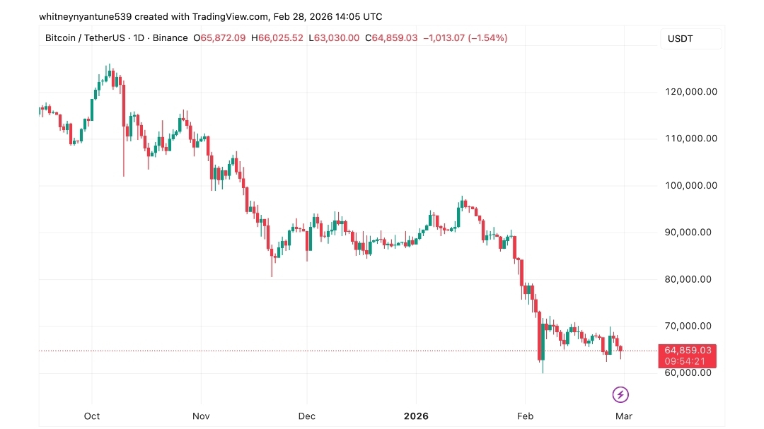 Cena $BTC ostatnio tworzyła niższe szczyty i niższe dołki na krótkoterminowych ramach czasowych, zgodnie z danymi TradingView. Załamanie na początku lutego przesunęło Bitcoina w kierunku strefy kapitulacji w pobliżu 60 000 dolarów.