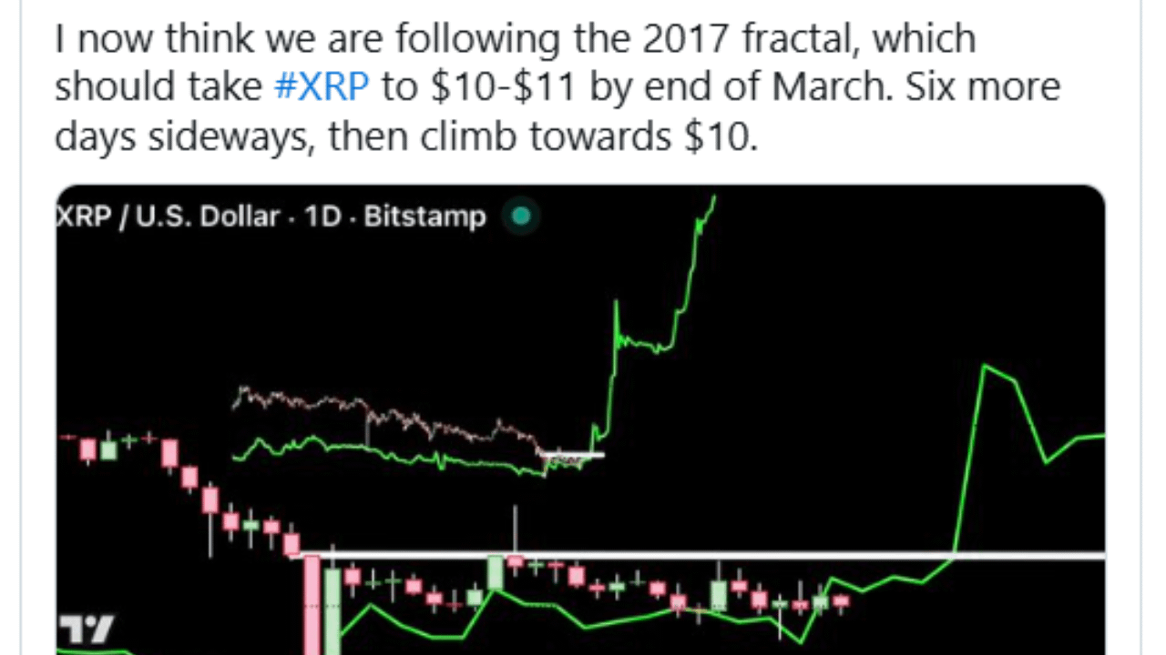 CryptoBull wydał już ambitne projekcje, w tym wybicie powyżej 2 dolarów do 3 marca, które jednak nie zostało zrealizowane. Inni analitycy w społeczności XRP nadal odwołują się do fraktala z 2017 roku jako do długoterminowej mapy drogowej, a niektórzy nawet przedłużają projekcje do 2026 roku.