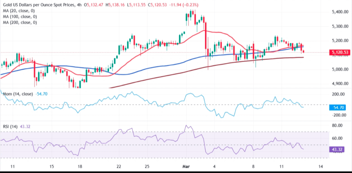 Na dziennym wykresie XAU/USD utrzymuje się lekko byczo, gdy cena walczy wokół rosnącej 20-dniowej SMA w pobliżu 5 120 USD i pozostaje wygodnie powyżej 100- i 200-dniowych SMA, które nadal trendują w górę i wzmacniają szerszy trend wzrostowy. Wskaźnik RSI kieruje się w dół tuż powyżej linii 50, podczas gdy wskaźnik Momentum pozostaje w pozytywnym terytorium, chociaż łagodnie, sugerując, że ostatni wzrost zwalnia, a nie cofa się na tym etapie.