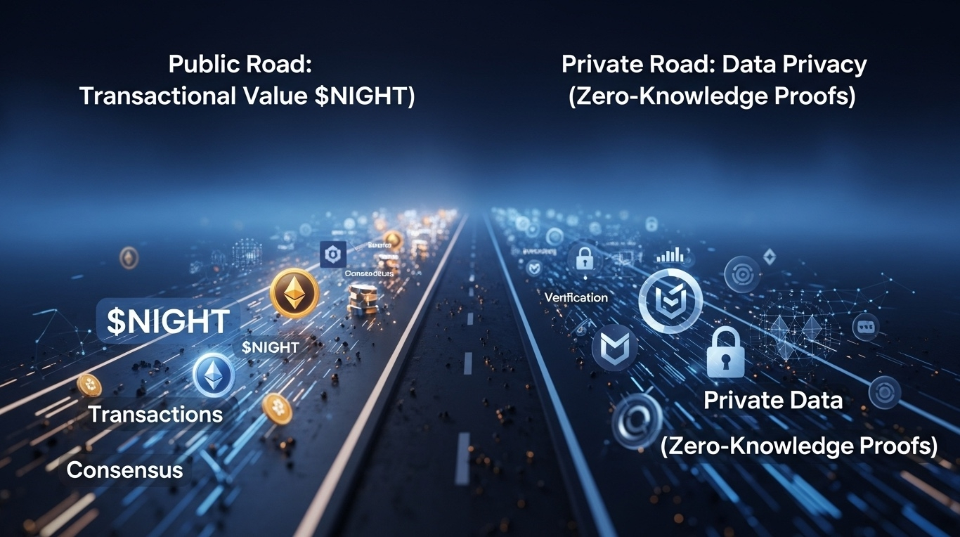 Midnight Network builds two roads instead of one. The public road handles token movement and network consensus. $NIGHT moves along this road. Transactions settle, nodes agree on the state of things, and the ledger stays visible to anyone who wants to look.