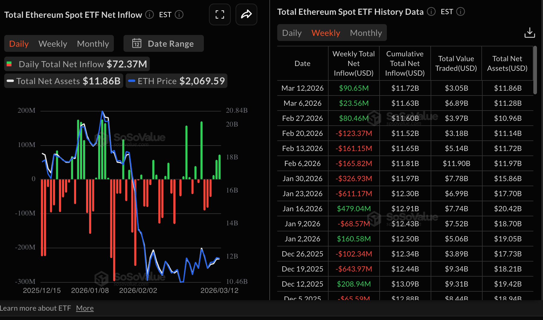 Ethereum spot ETFs are also set to extend inflows for three consecutive weeks, considering the nearly $91 million posted through Thursday. SoSoValue data shows that US-listed ETFs saw roughly $72 million in inflows on Thursday. Cumulative inflows stand at $11.72 billion with net assets at $11.86 billion.