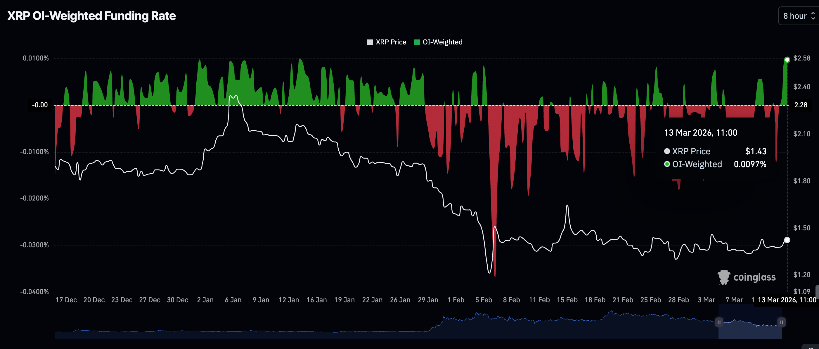 Meanwhile, retail investors are increasing their exposure, piling into XRP long positions, as shown by CoinGlass’s Open Interest (OI)-Weighted Funding Rate, which stands at 0.0097% on Friday, up from 0.0015% the previous day. The metric had stayed in the negative region for three days since Tuesday, underscoring an improving risk appetite.