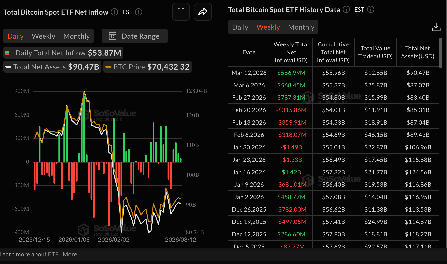 Bitcoin, on the other hand, is extending its recovery, trading above $71,000 on Friday from its weekly open of $65,971. Steady inflows into Spot Exchange-Traded Funds (ETFs) confirm the improving risk appetite despite the US-Iran war. SoSoValue data shows that BTC spot ETFs have recorded nearly $587 million in flows through Thursday this week, already indicating a slight increase from the previous week’s $568 million.