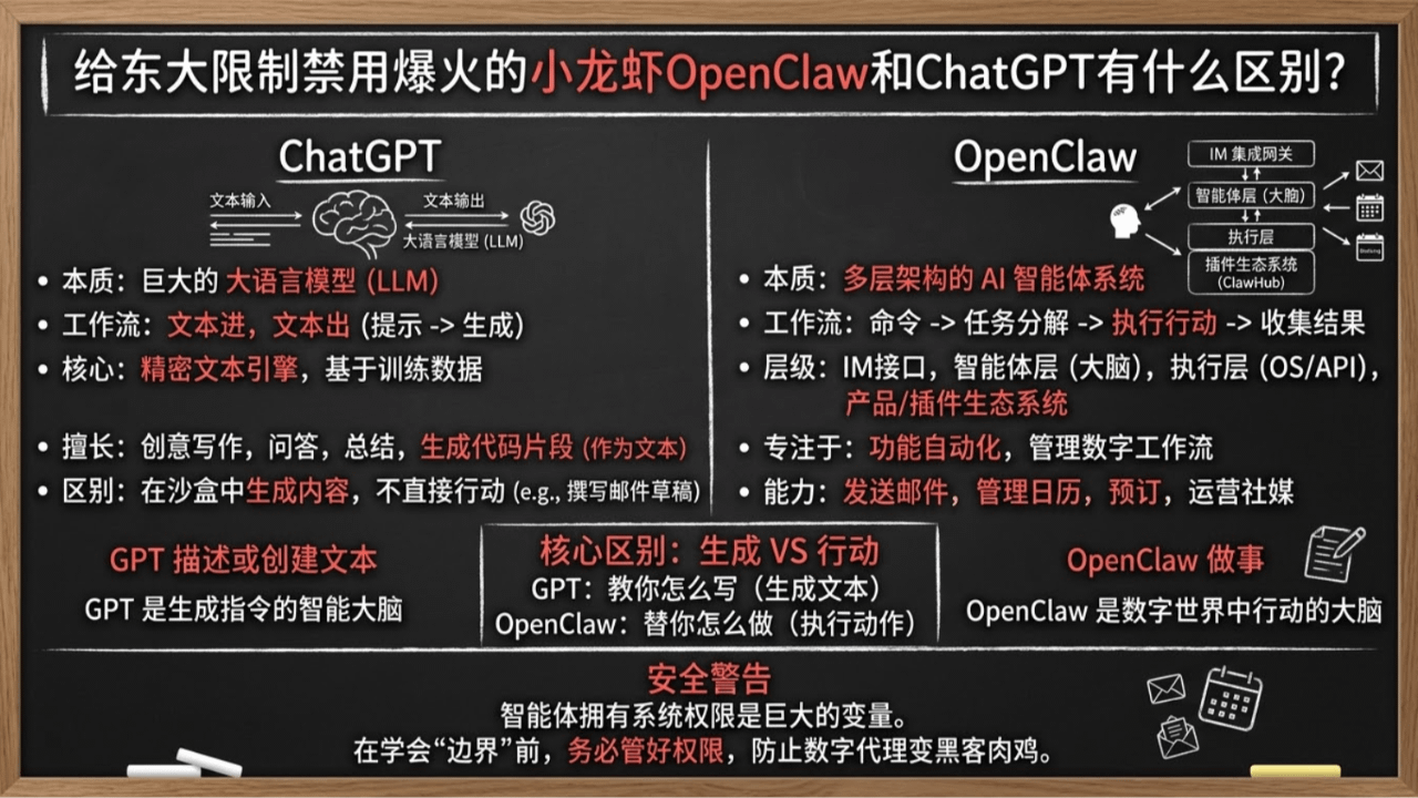 这种从纯生成到自主行动的转变是核心区别。GPT描述或创建文本;OpenClaw 做事。