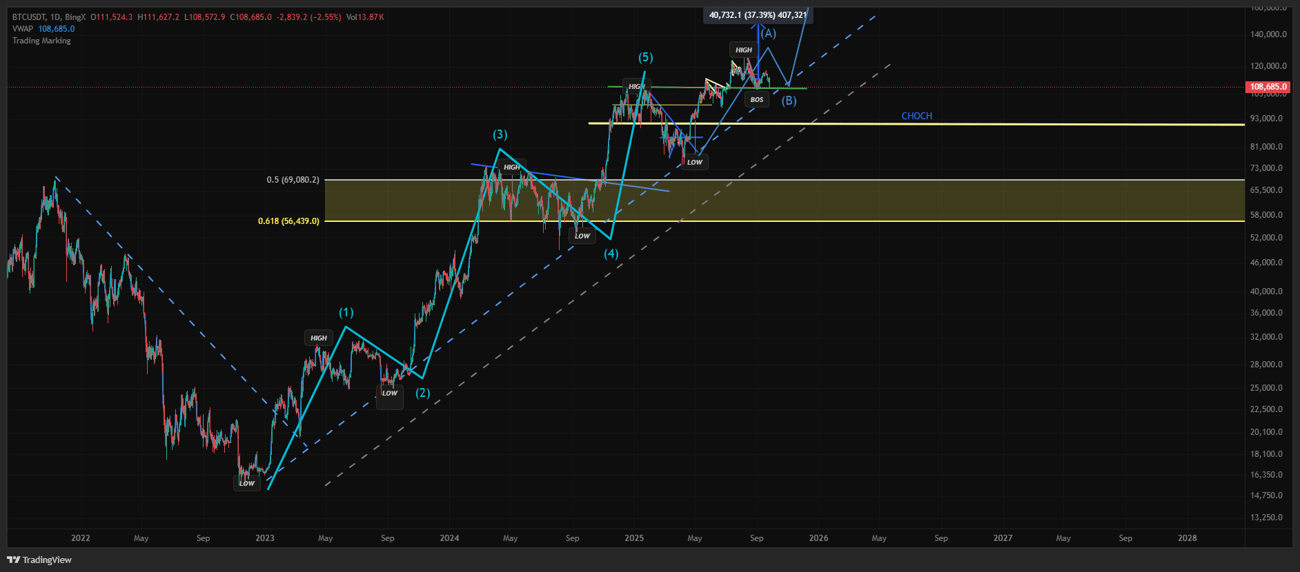Długoterminowy wykres BTC sugeruje, że jesteśmy głęboko w masywnym cyklu byka, po zakończeniu solidnej struktury 4-falowej. Głównym oczekiwaniem jest uformowanie końcowej fali impulsowej, Fala (5).