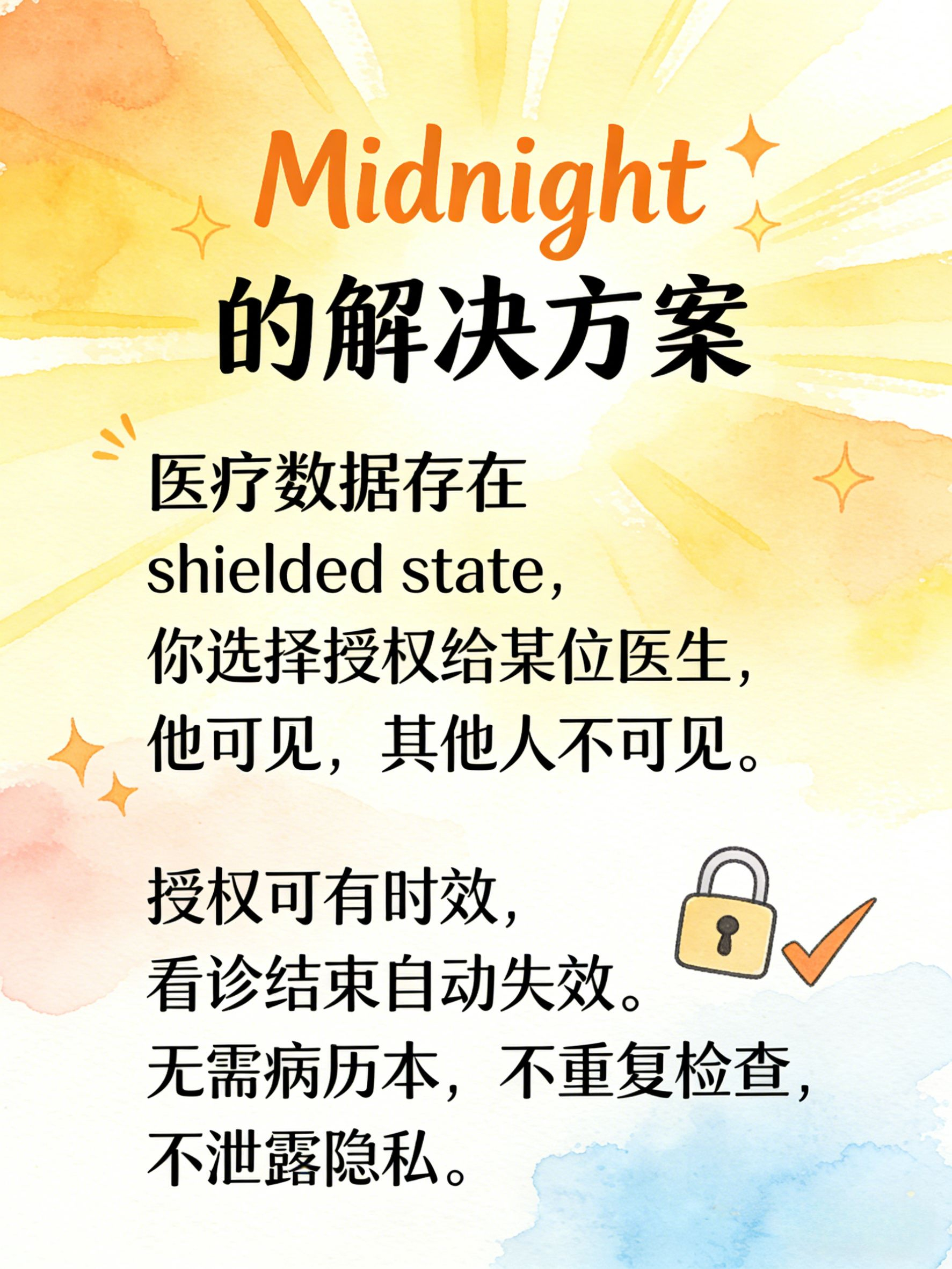医疗数据存在shielded state里,你选择授权给某家医院的某个医生,他能看见,其他人看不见。你不需要再带病历本,不需要担心数据在传输中泄露,不需要重复做已经做过的检查。