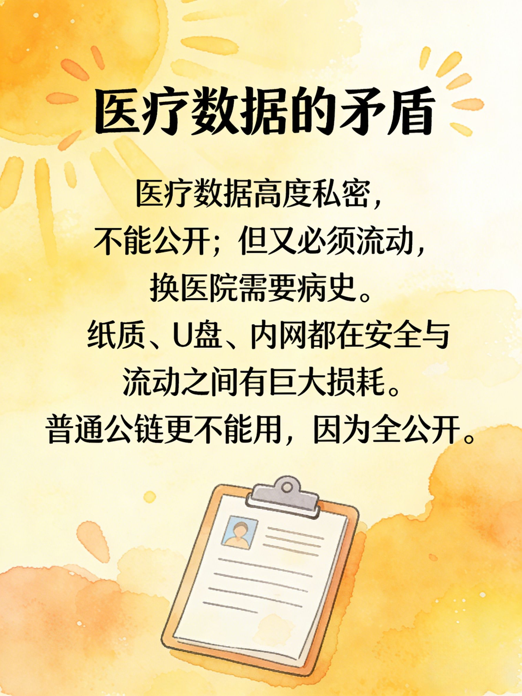 上链是一个方向,但普通的公链解决不了这个问题。你把病历上链,就等于把最私密的个人数据放到一个所有人都能看见的公开账本上。没有人会这么做。