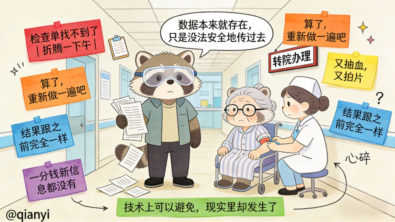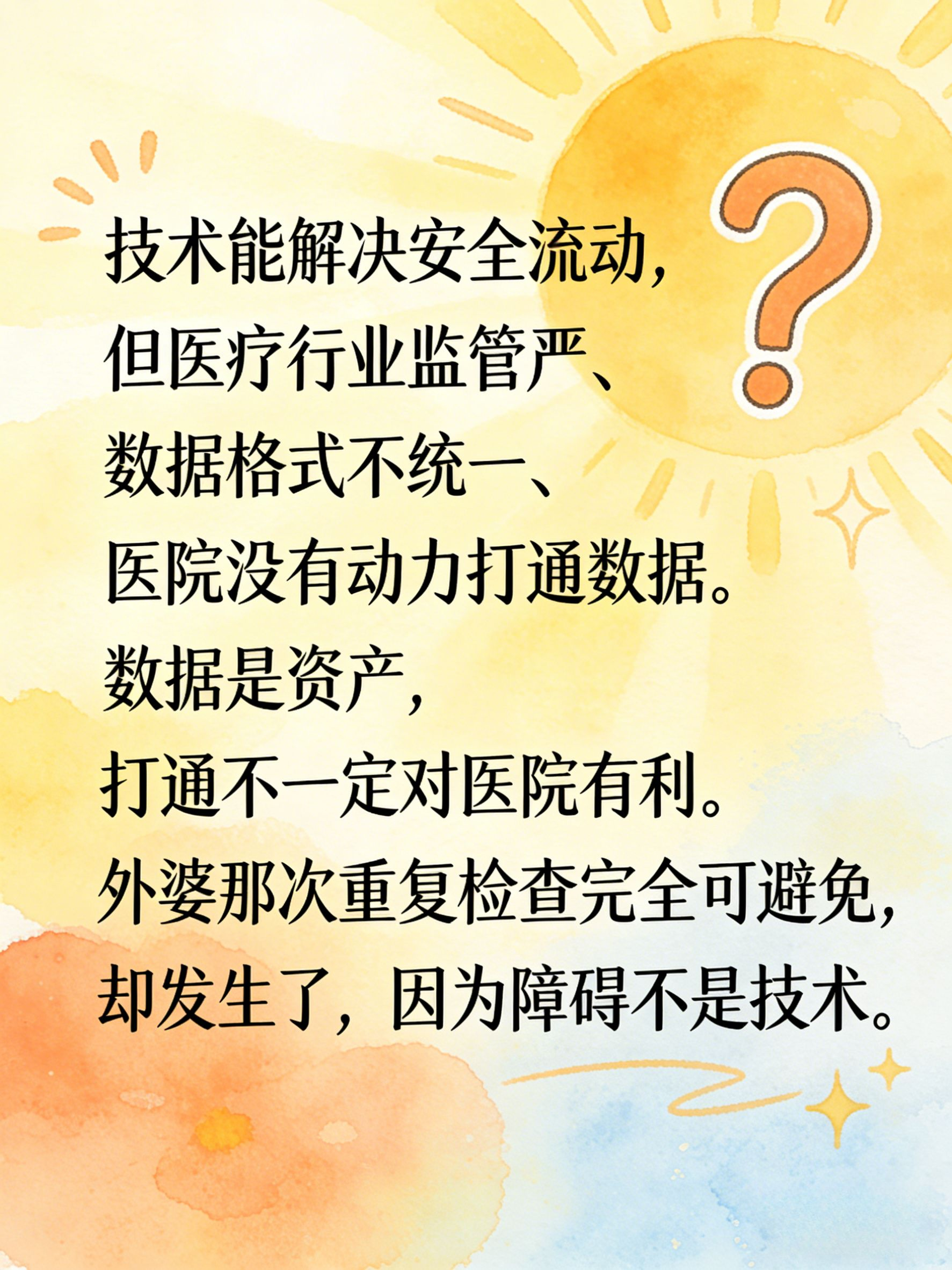 医疗行业是所有行业里监管最严、利益结构最复杂的领域之一。医院有自己的HIS系统,数据格式不统一,各家医院之间本来就没有打通的动力——数据是资产,打通意味着病人可以更容易地换医院,这对单家医院来说不一定是好事。