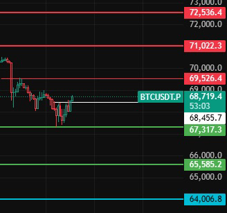 Bitcoin dzisiaj zwróć uwagę na poziom 68450, tylko jeśli utrzyma się powyżej tego poziomu przez 1-2 godziny, zacznie się korekta, zwróć uwagę na poziomy oporu 69530-71000-72540 w ich okolicy!