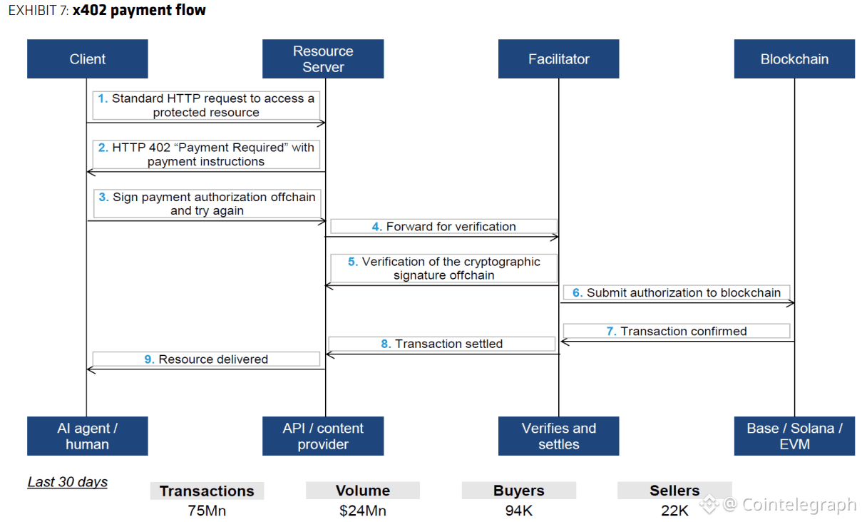 Bernstein’s chart put x402 volume at about $24 million over that period. x402 is a payment standard developed by Coinbase that lets AI agents automatically make payments over the internet.