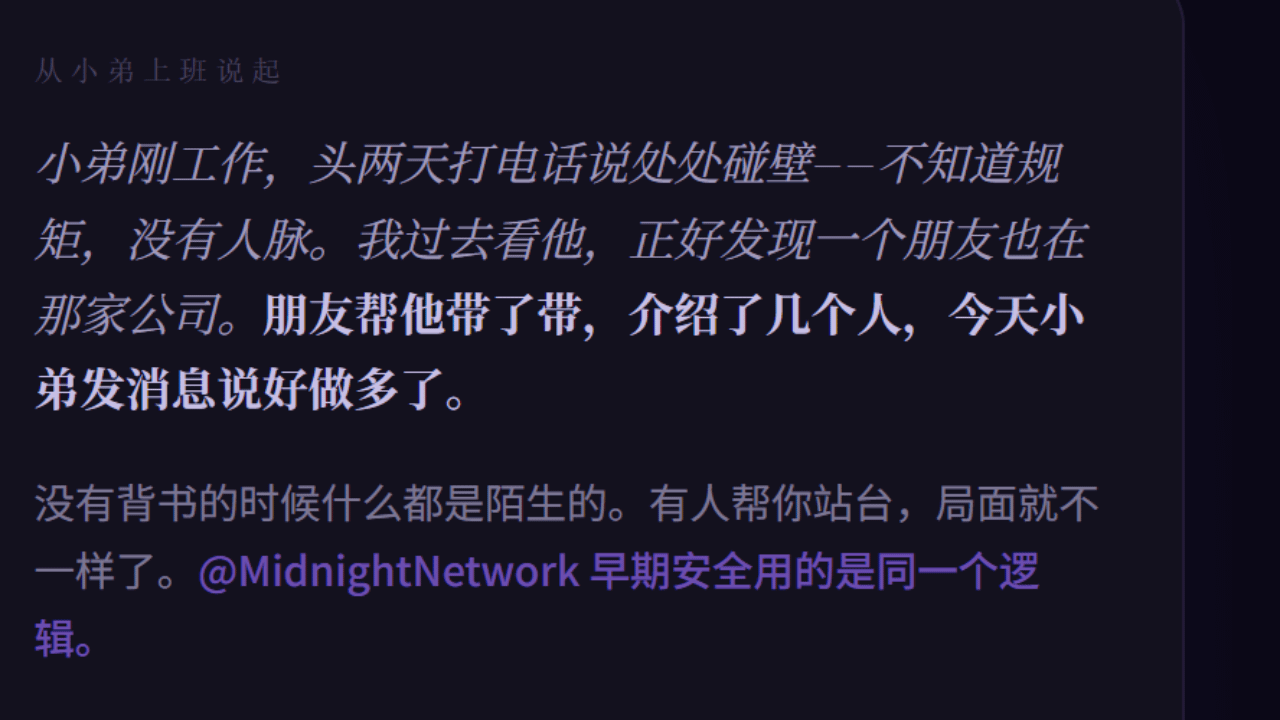 没有背书的时候什么都是陌生的,什么都要靠自己硬闯。有人帮你站台局面就不一样了。$NIGHT 所在的@MidnightNetwork 在早期安全用的是同一个逻辑。