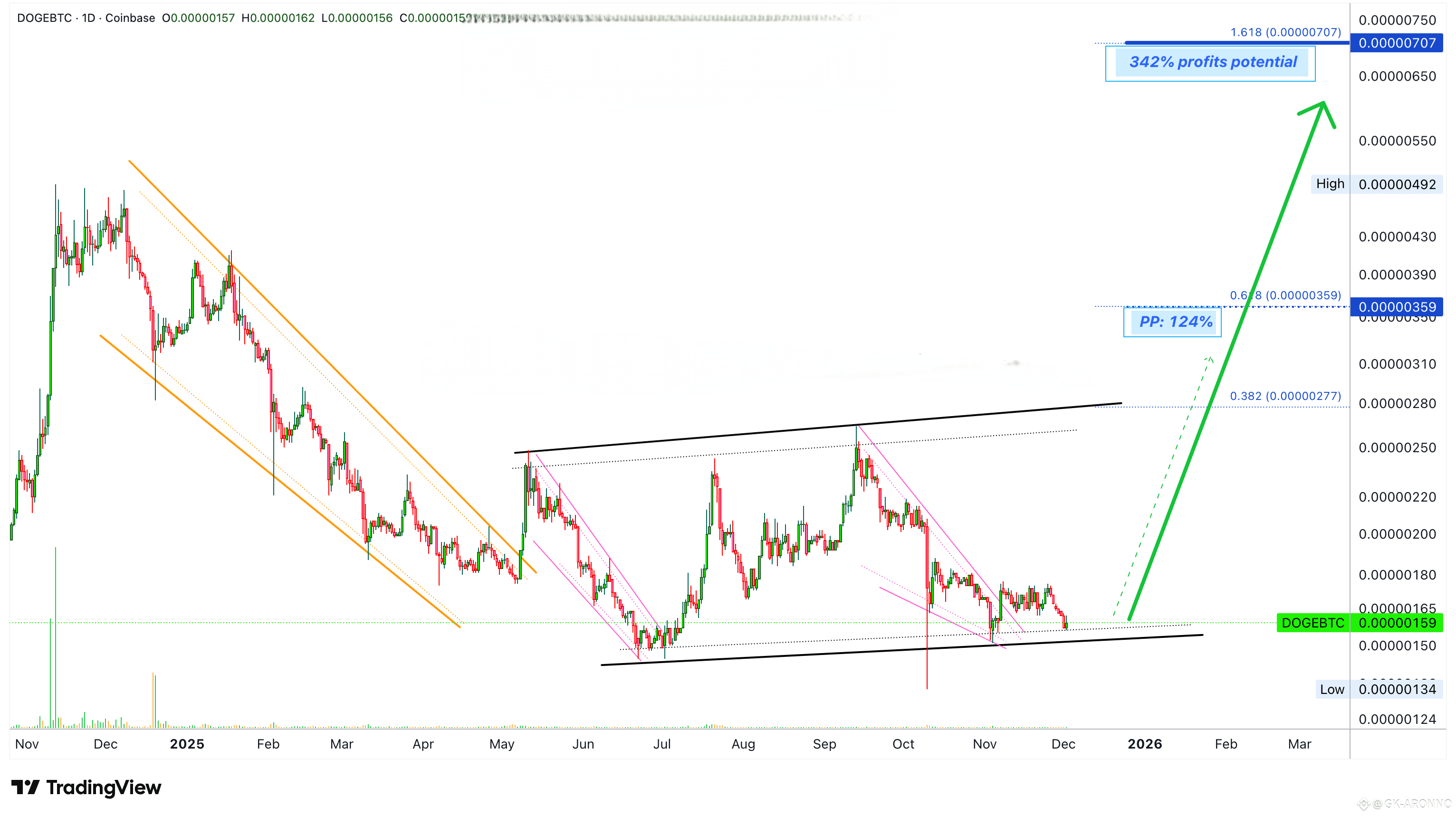 Kiedy mówię 'łatwy', mam to na myśli... Już przyjrzeliśmy się DOGEBTC w perspektywie długoterminowej (zobacz tutaj), całkowity potencjał wzrostu jest ogromny. Ten nowy wykres na dziennym interwale jest bardziej skoncentrowany na krótkoterminowym do średnioterminowym. Bardziej skupiony na teraz. Grudzień 2025, a może nawet styczeń i luty 2026. Idziemy w zielone.