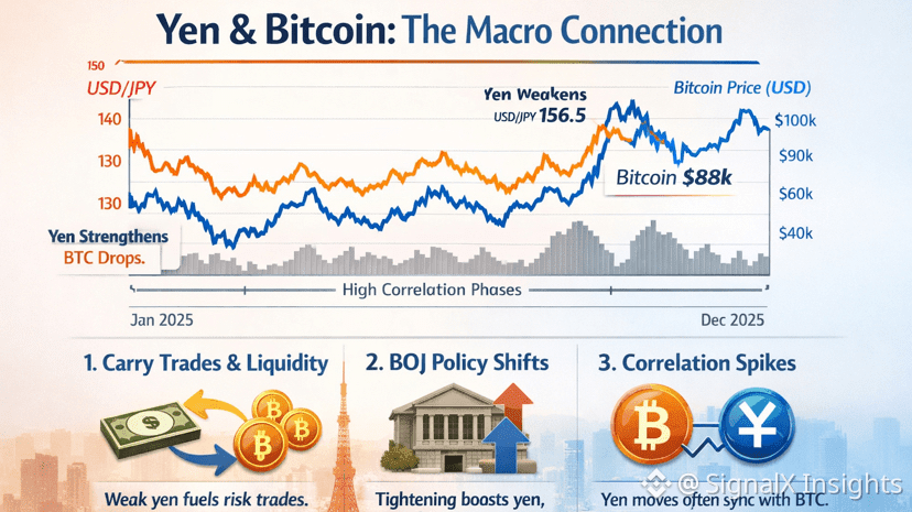 • Gdy jeny są tanie do pożyczenia (niskie japońskie stawki) i USD/JPY rośnie, inwestorzy pożyczają w jenach i inwestują środki w aktywa o wyższym zysku/ryzyku (akcje, kryptowaluty). Analitycy donieśli, że po ruchach BOJ w grudniu 2025 roku, osłabienie jena pomogło utrzymać transakcje carry trade, co wspierało BTC w rejonach $87–$90k. To jest główny kanał transmisji.