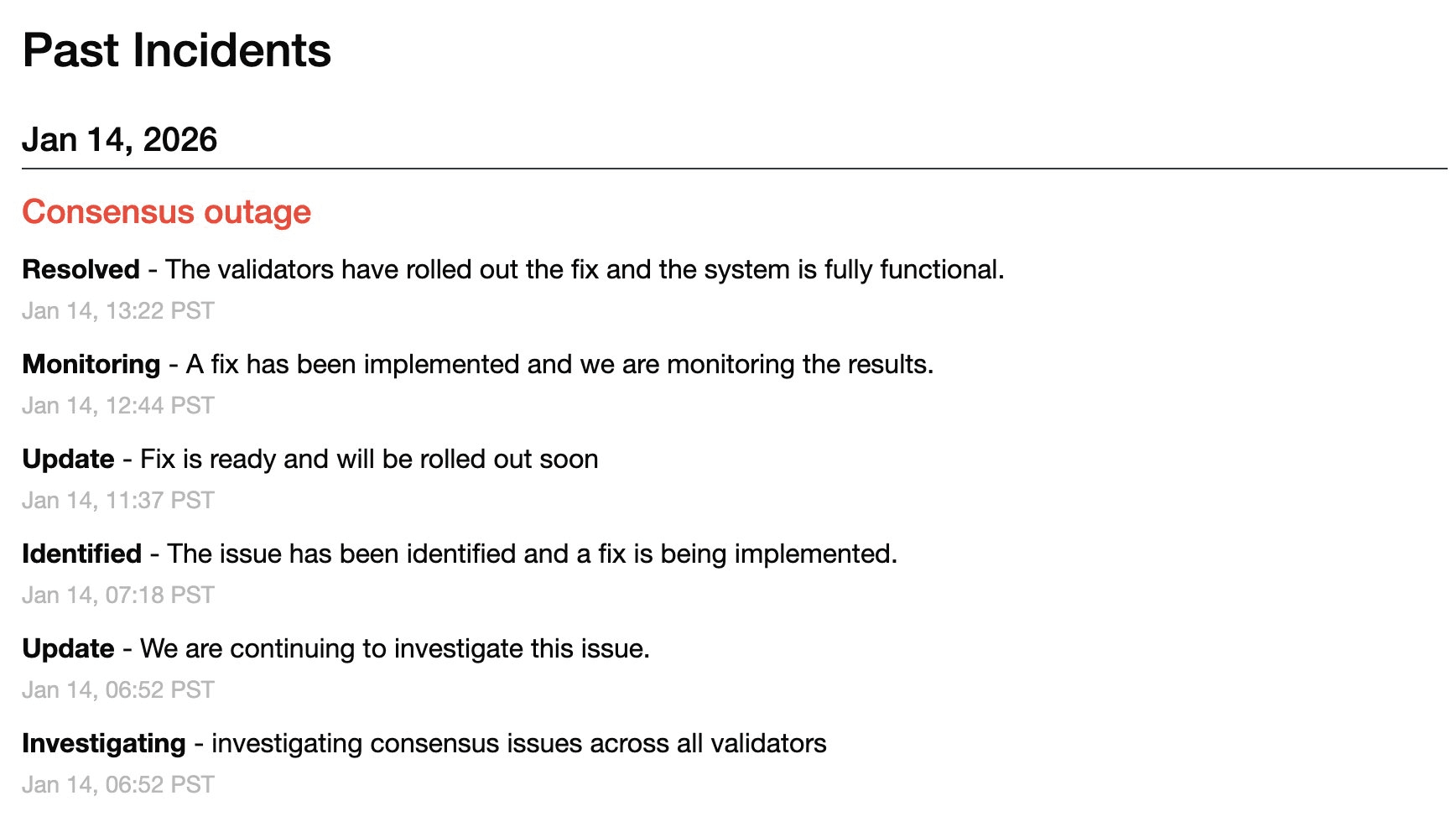 14 stycznia 22:52 (UTC+8): Oficjalnie potwierdzono, że wszyscy weryfikatorzy mają problemy z konsensusem, wszczęto dochodzenie;