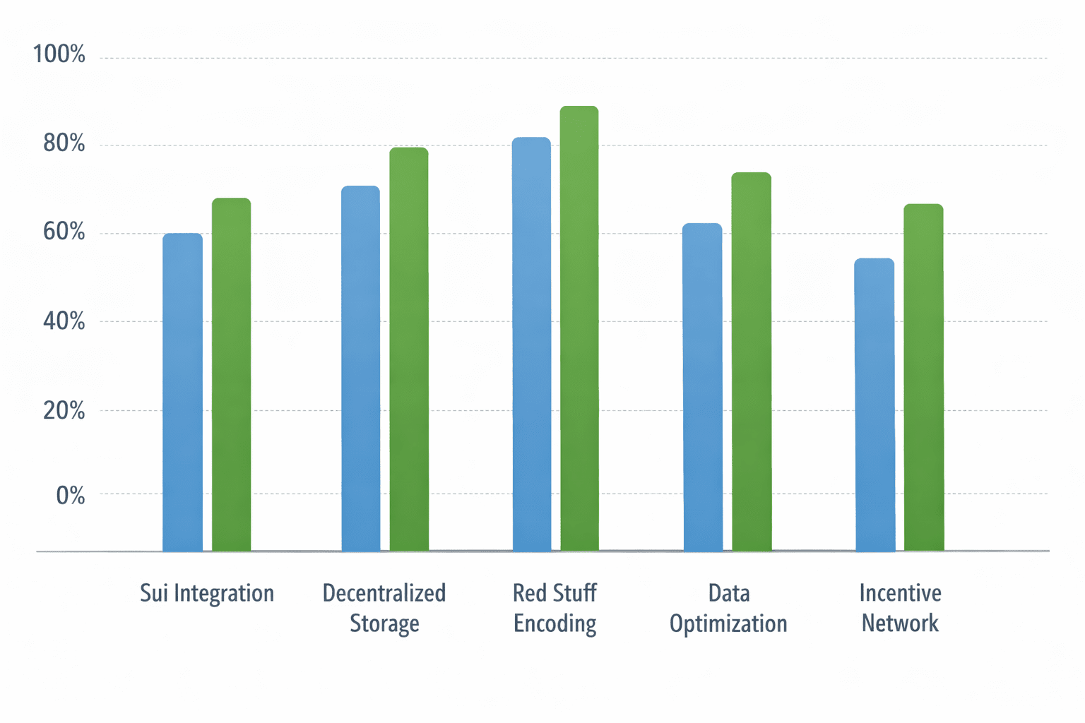 Kluczową innowacją protokołu Walrus jest jego system kodowania Red Stuff. Podejście to łączy kodowanie erasure z rozproszonym przechowywaniem blob, umożliwiając efektywne dzielenie, przechowywanie i odzyskiwanie plików w całej zdecentralizowanej sieci. Rezultatem jest silna dostępność danych, niższe koszty przechowywania i wysoka odporność na błędy, nawet jeśli wiele węzłów przestaje działać.